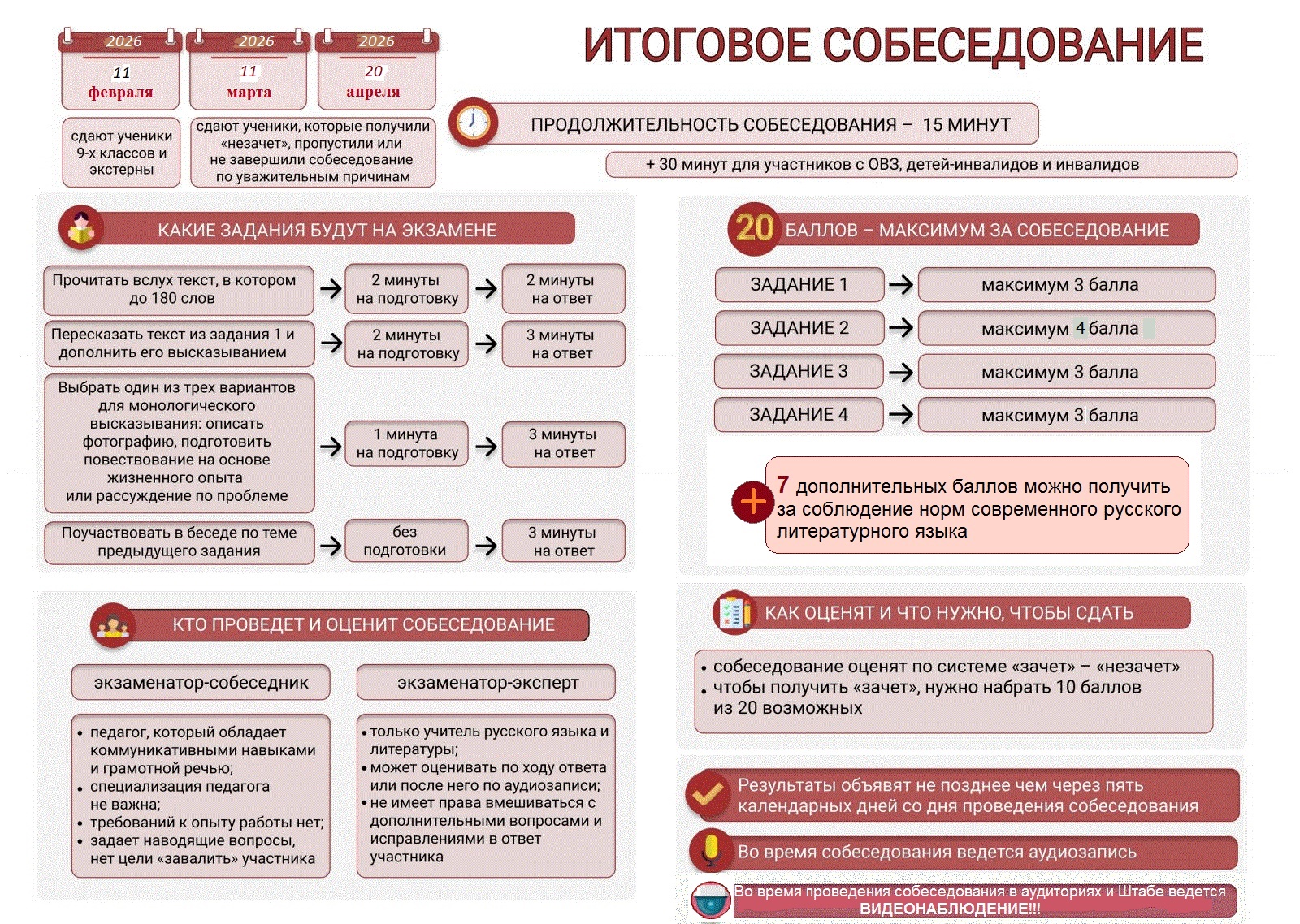 Ключевые изменения в 2025-2026 учебном году: Изменение формулировки в задании 3. Фраза «Не забудьте дать ответы на следующие вопросы» заменена на более мягкую: «Вы можете дать ответы на следующие вопросы». Это снимает излишнее давление на ученика. Увеличение балла за диалог. Максимальный балл за задание №4 (Диалог) увеличен до 3 баллов (ранее было 2). Баллы начисляются по принципу «1 развернутый ответ на вопрос = 1 балл». Убраны некоторые критерии. Из системы оценивания исключен критерий «Богатство речи». Также критерий «Соблюдение фактологической точности» теперь называется «Фактическая точность речи». Оценивание грамотности (максимум 7 баллов): Отдельно выставляются баллы за общую грамотность речи во всех четырех заданиях. Соблюдение орфоэпических норм (ударения, произношение): до 2 баллов. Соблюдение грамматических норм: до 2 баллов. Соблюдение речевых норм (отсутствие речевых ошибок): до 2 баллов. Фактическая точность речи (отсутствие искажения фактов): 1 балл. Важно: Если ученик не приступил к выполнению двух и более заданий, он автоматически получает 0 баллов за всю работу.
